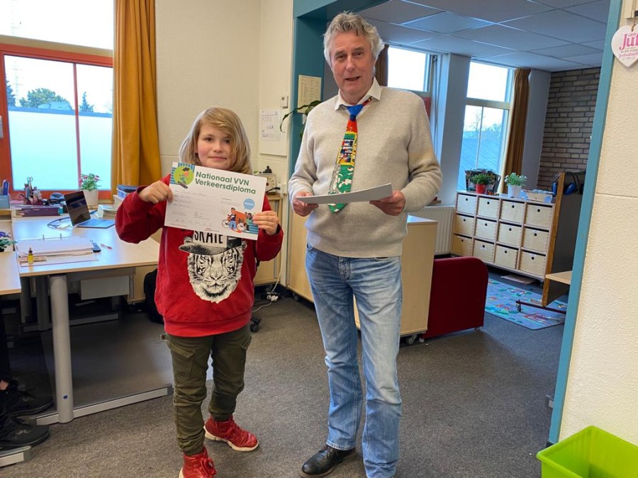 uitreiking certificaat theoriegedeelte verkeersexamen in klas Bo/Patty